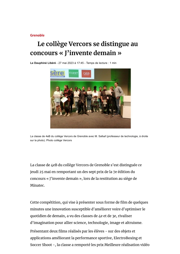 Pour des raisons de protection des données personnelles, ces films ne seront visibles - dans quelques jours - qu'après connexion à la partie sécurisée de l'ENT. Retrouvez ci-dessous l'article paru dans le Dauphine Libéré le samedi 27 avril 2023.